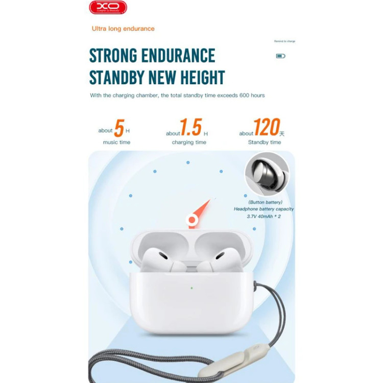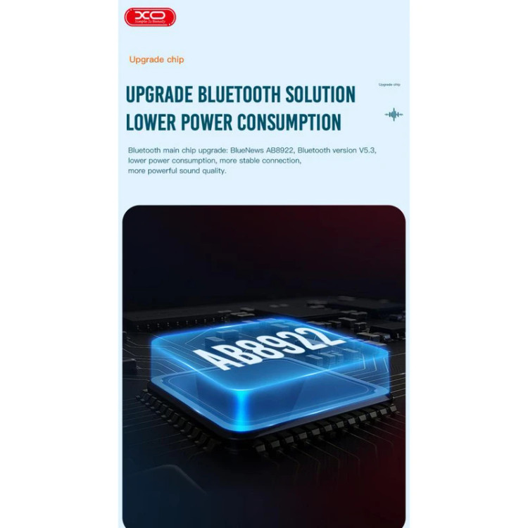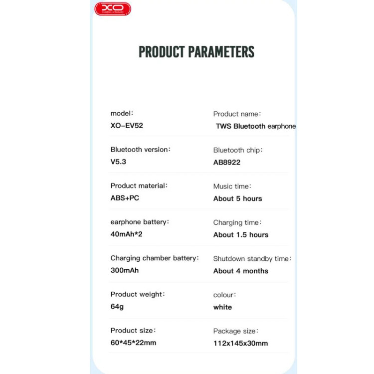 ایرپاد XO EV52 یک هدفون بیسیم از نوع نیمهگوش با اتصال بلوتوث نسخه ۵.۳ است که قابلیت حذف نویز فعال (ANC) دارد و در برابر عرق و پاشش آب مقاوم است. ظرفیت باتری گوشیها ۴۰ میلیآمپر ساعت و کیس شارژ ۳۰۰ میلیآمپر ساعت است که تا ۵ ساعت شارژدهی مداوم را فراهم میکند. از دیگر ویژگیهای آن میتوان به جفت شدن خودکار، میکروفون داخلی و پنل کنترل لمسی اشاره کرد.