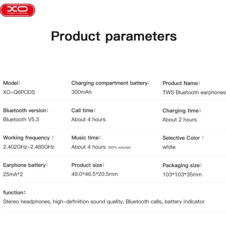 دیدن محصولات مرتبطایرپاد XO-Q6PODS یک هندزفری بلوتوثی با بلوتوث نسخه 5.3 است که به صورت بیسیم و با اتصال پایدار کار میکند و در رنگ سفید براق عرضه میشود. این هدفون حدود 4 ساعت زمان مکالمه و پخش موسیقی را با صدای 80 درصد ارائه میدهد و دارای طراحی ارگونومیک است.