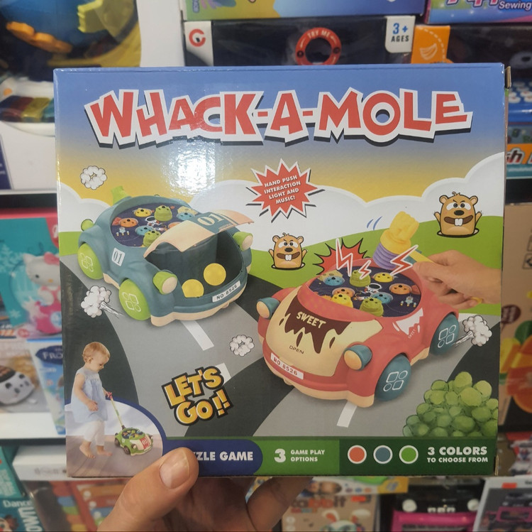 ماشین چکشی .حیوانات داخل ماشین بالا و پایین میشوند و چراغ ها روشن خاموش میشود و اهنگ میزند. چکش برای زدن روی حیوانات و یک عصای بلند برای وصل کردن به ماشین که کودک بتواند ماشین را به حرکت در بیاورد