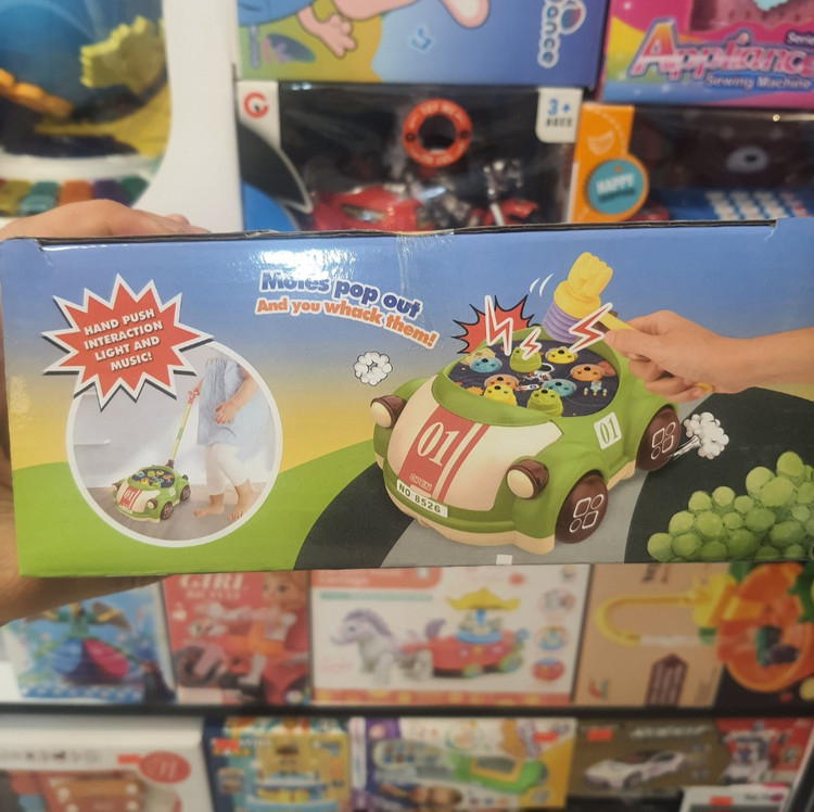 ماشین چکشی .حیوانات داخل ماشین بالا و پایین میشوند و چراغ ها روشن خاموش میشود و اهنگ میزند. چکش برای زدن روی حیوانات و یک عصای بلند برای وصل کردن به ماشین که کودک بتواند ماشین را به حرکت در بیاورد